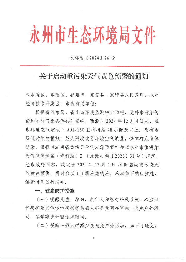 關(guān)于啟動(dòng)重污染天氣黃色預(yù)警的通知